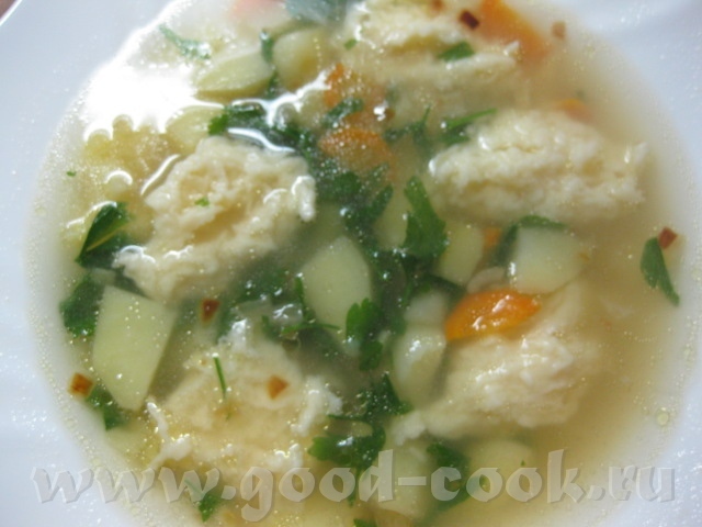 Когда картофель почти готов, добавить в суп клецки: небольшой ложечкой аккуратно набрать кусочек теста и переложить его в суп (чтобы тесто не прилипало к ложке, ее надо периодически смачивать водой).